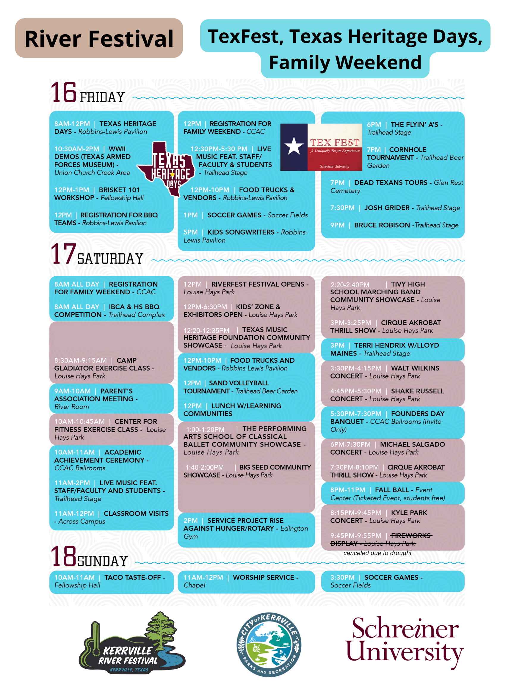 The Kerrville River Festival is intended to inspire and motivate Texans to get outside for a healthy, fun day of adventure, exercise, viewing exhibits,  and celebrating the heritage and culture of Kerrville.